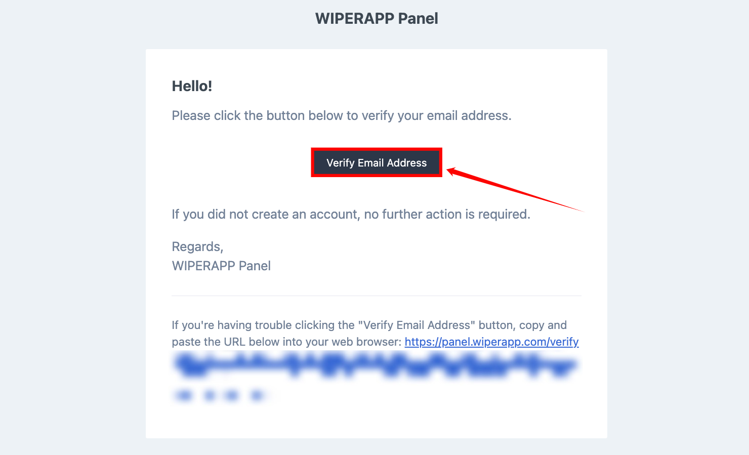 Step 3: Complete the email verification. Check the email from the WIPERAPP server and click on the Verify Email Address button.