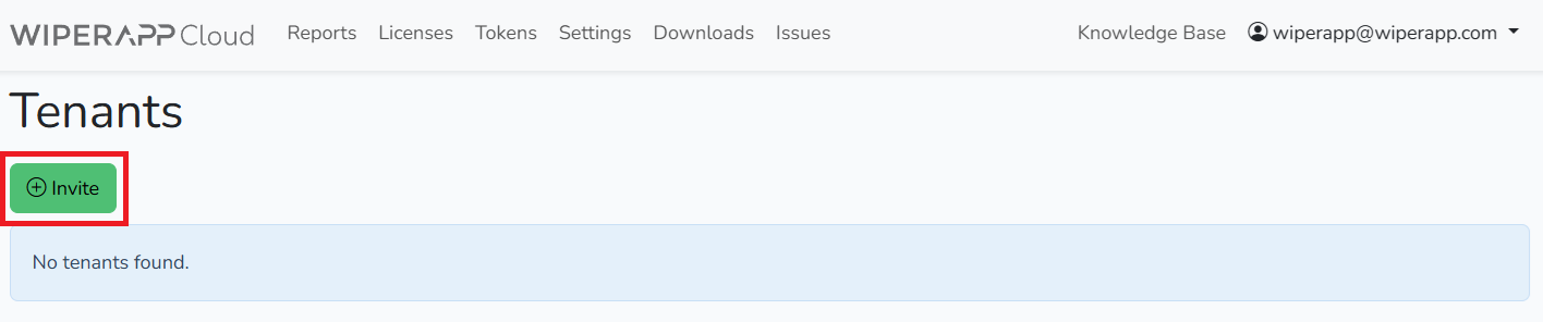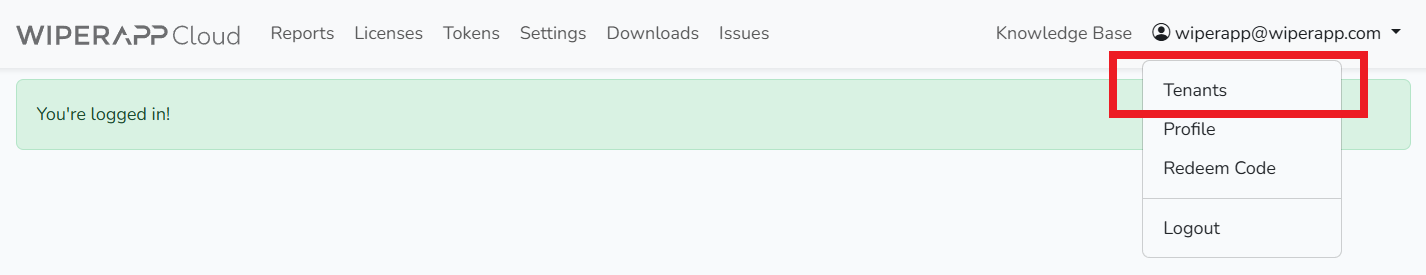 Step 3: Click on your email address in the top right corner (next to “Knowledge Base”), then select “Tenants” from the menu