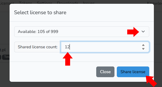 Step 2: Use the small dropdown arrow to select which license package you want to share from, then enter the number of licenses you want to share and click “Share licence”