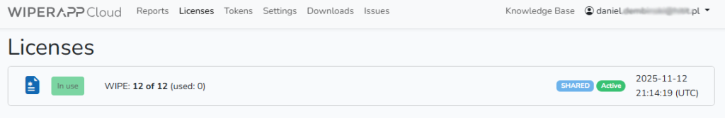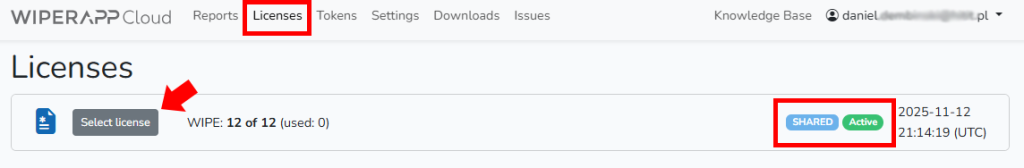 Step 2: Go to the “Licenses” tab and check that you have licenses marked as “SHARED” and “Active”. Click the “Select license” icon to activate the shared licenses